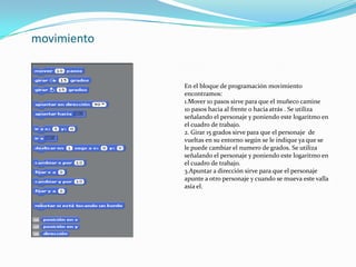 El documento describe las diferentes funciones de movimiento, apariencia, sonido y otros controles que se pueden aplicar a un personaje en un programa de animación. Algunas funciones mencionadas incluyen mover un personaje 10 pasos, girarlo 15 grados, cambiar su disfraz, emitir sonidos y borrar texto o animaciones previamente agregadas.