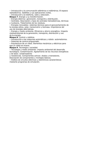 El documento describe 9 bloques de contenidos para un tercer curso. Los bloques cubren temas como el proceso de resolución de problemas tecnológicos, hardware y software, técnicas de expresión y comunicación, materiales de uso técnico, electricidad y electrónica, tecnologías de comunicación e Internet, energía y su transformación, control y robótica, y tecnología y sociedad.
