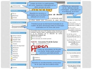 Los bloques de Moodle son elementos que se añaden a las páginas de los cursos para proporcionar información rápida y acceso a herramientas útiles para profesores y estudiantes. Cada versión de Moodle tiene bloques estándar e instalables que son flexibles y pueden moverse o eliminarse. Algunos bloques comunes son el calendario, lista de participantes, eventos próximos y actividades, los cuales brindan información sobre eventos, personas y contenidos del curso de manera accesible.