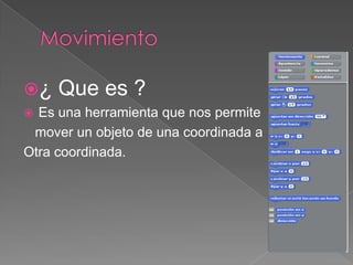 El documento habla sobre bloques de programación, que son herramientas que permiten mover u ordenar objetos en diferentes coordenadas o darles movimiento personalizado como giros. Los bloques de programación tienen diversas opciones como trasladar u operar propiedades avanzadas de los objetos para customizar su movimiento a través de la duración o velocidad.