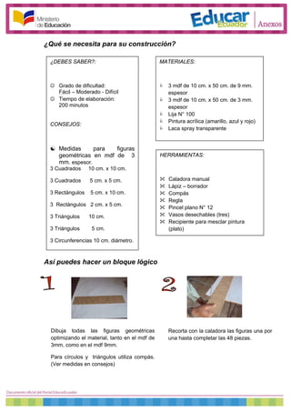 Este documento describe los materiales y pasos necesarios para construir bloques lógicos de Dienes. Estos bloques consisten en 48 piezas de diferentes formas (triángulos, cuadrados, círculos y rectángulos), tamaños, espesores y colores, que pueden combinarse de varias maneras. Se necesitan mdf de diferentes espesores, pintura acrílica, laca transparente y herramientas como caladora, lápiz y pincel para cortar y pintar las piezas siguiendo las medidas indicadas.