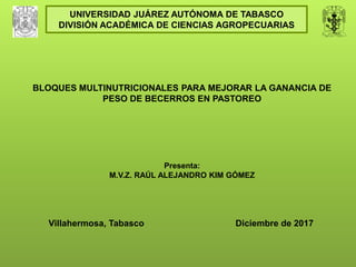 El documento presenta un análisis sobre el uso de bloques multinutricionales para mejorar la ganancia de peso de becerros en pastoreo en Tabasco, México, donde la producción bovina enfrenta desafíos debido a la baja disponibilidad y calidad del forraje. Se propone la elaboración y prueba de estos bloques como suplemento para los animales, con el objetivo de mitigar la pérdida de peso durante la temporada de sequía y mejorar la productividad de las unidades de producción. Además, se implementan registros productivos para un mejor control y manejo ganadero, demostrando que estas estrategias pueden resultar en aumentos significativos en la ganancia de peso de los animales.