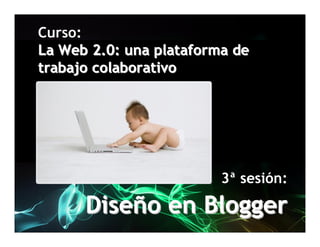 Este documento presenta la tercera sesión de un curso sobre la Web 2.0 y el diseño en Blogger. Explica que hay cuatro opciones de diseño en Blogger y algunos trucos. También define Twitter como un servicio gratuito de microblogging que permite enviar mensajes cortos llamados tweets de hasta 140 caracteres en respuesta a la pregunta "¿Qué estás haciendo?".
