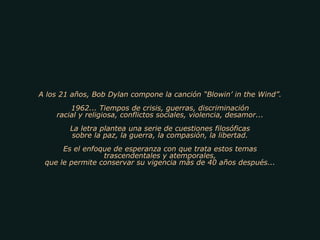 A los 21años, Bob Dylan compone la canción “Blowin’ in the Wind”. 1962... Tiempos de crisis, guerras, discriminación racial y religiosa, conflictos sociales, violencia, desamor... La letra plantea una serie de cuestiones filosóficas sobre la paz, la guerra, la compasión, la libertad. Es el enfoque de esperanza con que trata estos temas trascendentales y atemporales, que le permite conservar su vigencia más de 40 años después...