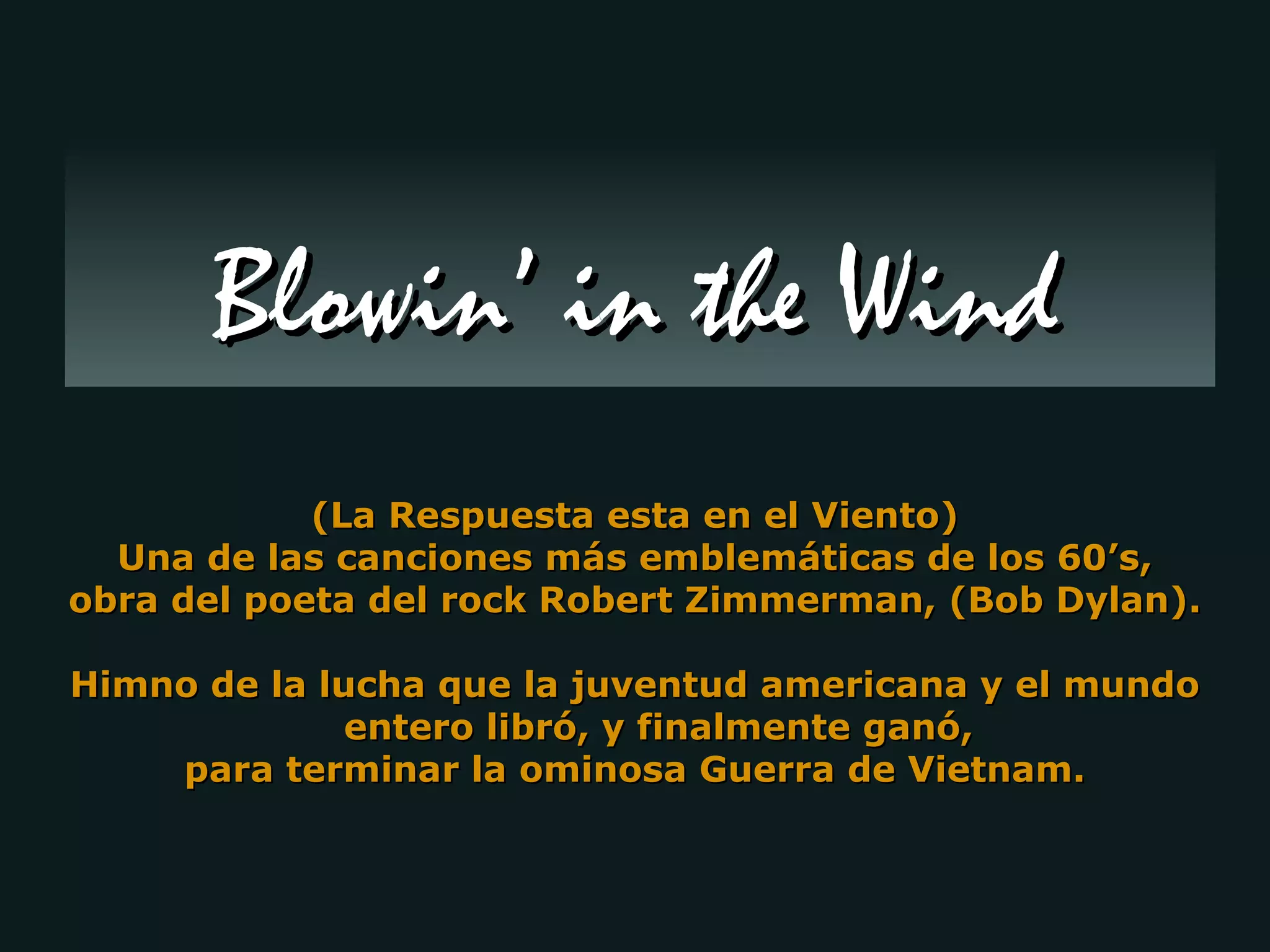La canción 'Blowin' in the Wind' de Bob Dylan, emblemática de los años 60, se ha convertido en un himno por la paz y la lucha contra la guerra de Vietnam. A través de preguntas filosóficas, la letra aborda temas de compasión, libertad y la búsqueda de respuestas, manteniendo su relevancia más de 40 años después. La canción invita a la reflexión sobre la condición humana y la necesidad de escuchar las voces de quienes sufren.