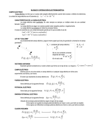 Este documento resume los conceptos fundamentales del campo eléctrico y magnético, incluyendo la definición de carga eléctrica, la ley de Coulomb, el campo eléctrico creado por una carga puntual, las líneas de campo eléctrico, el potencial eléctrico, la energía potencial eléctrica, el movimiento de cargas en campos eléctricos uniformes y no uniformes, la comparación entre el campo eléctrico y gravitatorio, la definición de campo magnético, la fuerza magn