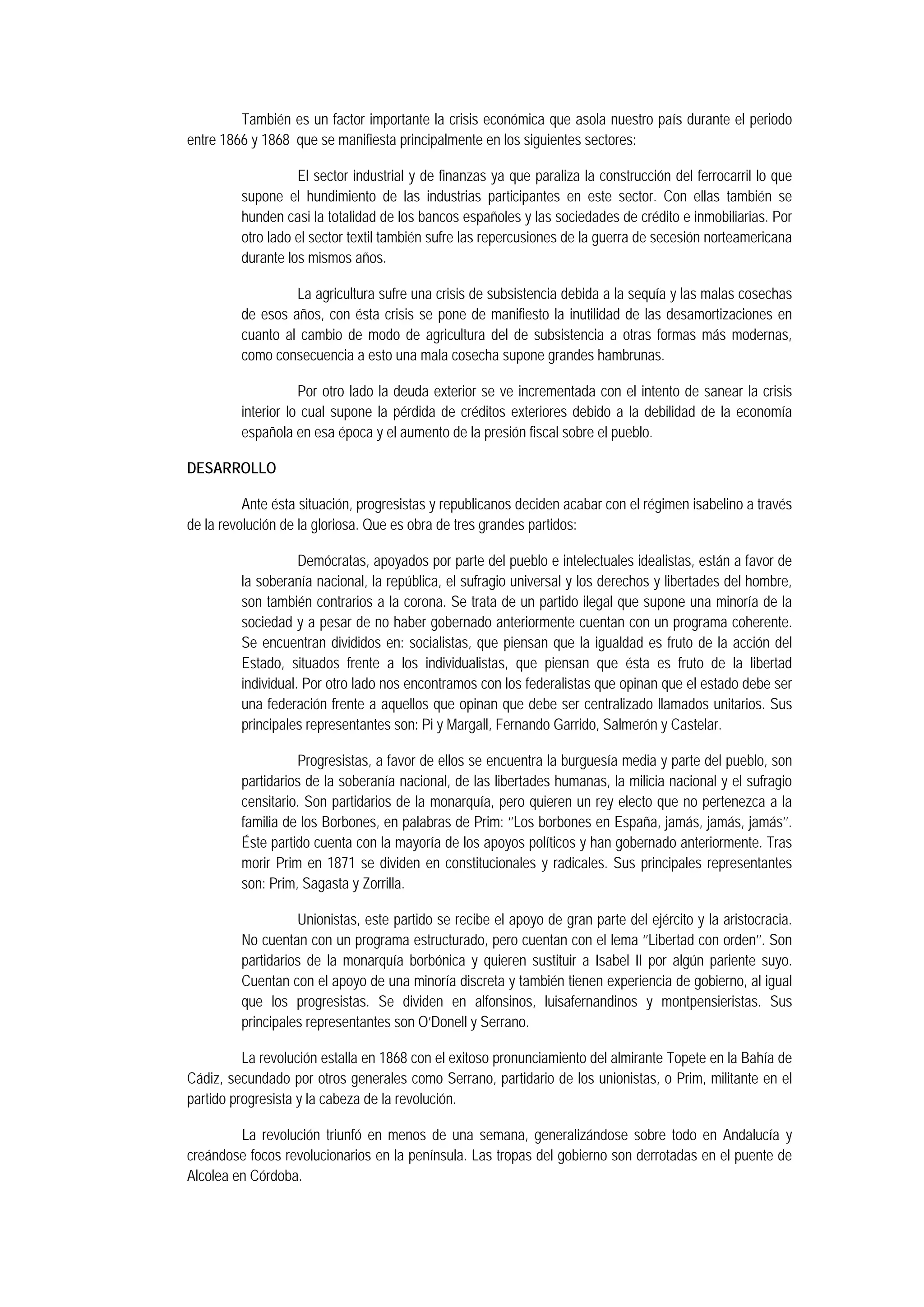 El documento describe el período de 1868 a 1874 en España conocido como el Sexenio Revolucionario, que incluyó varios intentos de establecer un gobierno democrático, primero bajo una monarquía y luego bajo una república. La Revolución de La Gloriosa en 1868 derrocó a la reina Isabel II e inició el Sexenio, durante el cual se promulgó la Constitución de 1869 y se eligió a Amadeo I como monarca. Sin embargo, Amadeo I renunció en 1873 debido a la opos