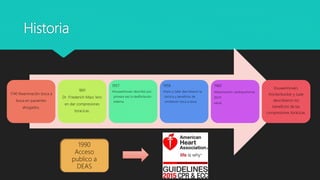 Este documento resume la historia y recomendaciones actuales de la RCP. Describe la evolución de la RCP desde las primeras maniobras de reanimación en 1740 hasta las guías actuales de 2015 de la AHA. Resalta la importancia de iniciar RCP de alta calidad con compresiones torácicas efectivas y desfibrilación precoz para aumentar las tasas de supervivencia en paro cardíaco.