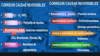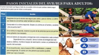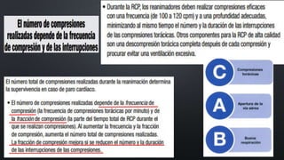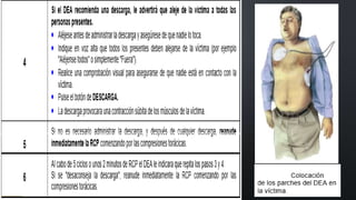 Este documento proporciona información sobre un curso de RCP básico. Cubre temas como la definición de parada cardiorrespiratoria y muerte súbita, los pasos básicos de RCP para adultos que incluyen 30 compresiones torácicas seguidas de 2 ventilaciones, el uso de un desfibrilador externo automático, y el tratamiento de una obstrucción de la vía aérea por cuerpo extraño. El objetivo del curso es enseñar habilidades para salvar vidas de víctimas de