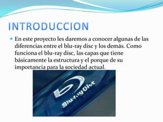 El documento describe la estructura y funcionamiento del disco Blu-ray, explicando que usa un láser azul de 405 nanómetros para almacenar hasta 25 GB por capa, mucho más que un DVD, y concluye resaltando lo avanzada que es esta tecnología en comparación con discos anteriores.
