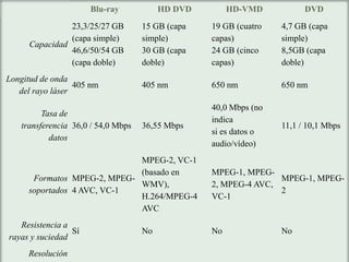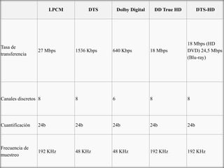Este documento presenta un proyecto de investigación sobre Blu-ray realizado por 5 estudiantes de la Universidad Dominicana. El proyecto cubre temas como el funcionamiento, capacidad de almacenamiento y tecnología de Blu-ray, así como códecs de video y audio, protecciones anticopia, compatibilidad con otros formatos y tipos de audio y video soportados.
