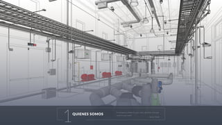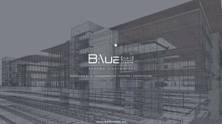 Este documento presenta a Blue AEC Studio, una empresa de modelado BIM fundada en 2013 en Panamá y Costa Rica. Ofrece servicios de desarrollo BIM, documentación constructiva BIM, detección de interferencias, simulación de construcción, cuantificación y captura de realidad. Cuenta con más de 30 profesionales y ha modelado más de 1,000,000 m2 en proyectos gubernamentales, institucionales y privados. Su objetivo es proporcionar modelos inteligentes que permitan una mejor ejecución de proyectos.