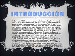 El blues se originó a principios del siglo XX en el sur de Estados Unidos, donde los esclavos africanos cantaban canciones de trabajo que más tarde evolucionaron en el género del blues. El blues se caracteriza por el uso de "notas azules" y la técnica de llamada y respuesta, y trata temas como las dificultades de la vida de los afroamericanos. El blues luego se extendió y transformó en un sonido urbano influyente que nutrió el desarrollo de muchos otros géneros musicales populares.
