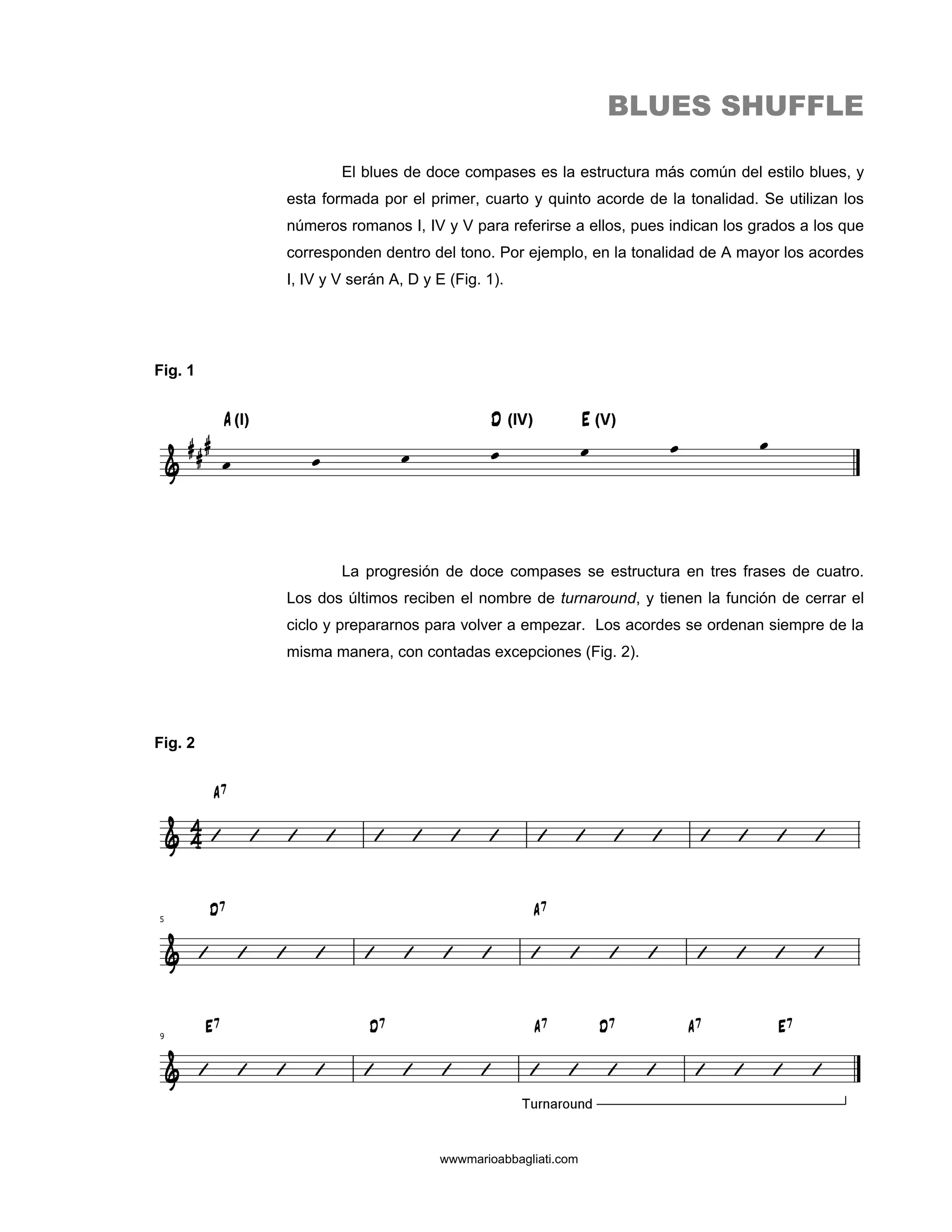 La estructura más común del blues es una progresión de 12 compases formada por los acordes I, IV y V de la tonalidad, como A, D y E en la tonalidad de A mayor. La progresión se divide en tres frases de cuatro compases y los últimos dos compases sirven para cerrar el ciclo y preparar para volver a empezar, aunque a veces el acorde IV aparece en el segundo compás en lugar del primero.