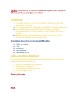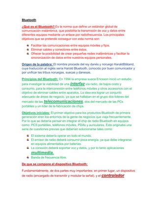Bluetooth es una norma global para comunicación inalámbrica que permite la transmisión de voz y datos entre dispositivos mediante radiofrecuencia. Su objetivo es facilitar la comunicación entre equipos móviles y fijos eliminando cables y conectores. Kleer es una tecnología inalámbrica para audio que permite la conexión de hasta 4 auriculares manteniendo la calidad de sonido y ahorrando batería ajustando la potencia del transmisor a la distancia del receptor. Zigbee define protocolos para aplicaciones inalámbricas de