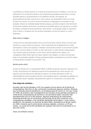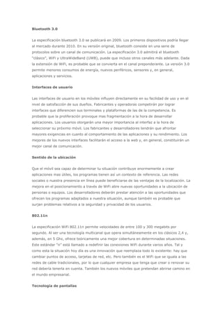 El documento habla sobre la evolución de la tecnología Bluetooth. La versión 3.0 permitirá comunicaciones a través de WiFi y otras redes, posiblemente incluyendo UltraWideBand, además del Bluetooth clásico. Esto permitirá menores consumos de energía y nuevas aplicaciones. También menciona que las interfaces de usuario de los teléfonos móviles influyen en la satisfacción de los usuarios y que los fabricantes competirán por lograr las mejores interfaces. Finalmente, explica que el sentido de ubicación a través de