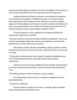 El documento describe un incidente en una fiesta de bodas en la década de 1970 en México. El narrador y sus familiares se emborracharon y comenzaron a coquetear con otras personas en otra mesa, lo que provocó una confrontación. Para evitar una pelea, el narrador fingió ser un "guarura" (guardaespaldas) para asustar a los otros hombres y hacerlos huir de la fiesta. Aunque no hubo violencia, el engaño le permitió resolver la situación de manera pacífica.