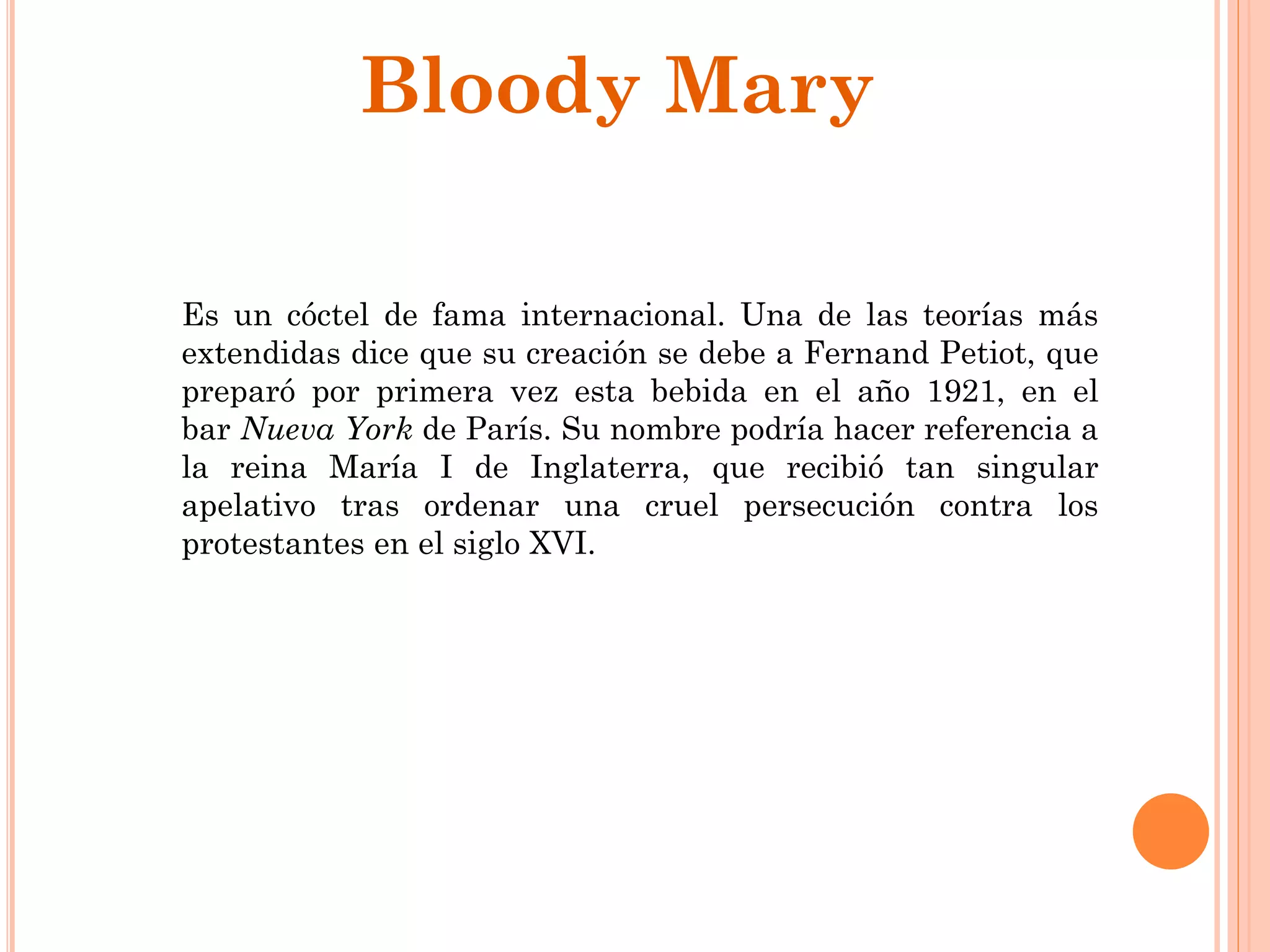 El Bloody Mary es un cóctel famoso creado en 1921 en París por Fernand Petiot. Su nombre podría hacer referencia a la reina María I de Inglaterra, conocida por su cruel persecución de los protestantes en el siglo XVI. Se prepara con vodka, jugo de tomate, jugo de limón, salsa inglesa, salsa Tabasco, sal, pimienta y un tallo de apio.