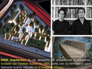 BNKR Arquitectura es un despacho de arquitectura fundado en 2005 en la Ciudad de México por Esteban y Sebastián Suárez. El despacho ha explorado proyectos a gran escala como planes maestros de ciudades y pequeñas capillas. Sus diseños buscan soluciones únicas a problemas específicos más que seguir un estilo personal. Algunos proyectos notables incluyen la Capilla del Atardecer en Acapulco, la Capilla La Estancia en Cuernavaca y el Rascasuelos en la Ciudad de México.