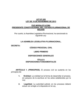 Este documento presenta el Código Procesal Civil de Bolivia. Establece los principios fundamentales del proceso civil como la oralidad, legalidad, dispositivo, dirección, inmediación, concentración, publicidad, saneamiento, gratuidad, celeridad, interculturalidad, transparencia, igualdad procesal, eventualidad, contradicción, verdad material y probidad. También define las funciones y competencias de las autoridades judiciales, así como los procedimientos para resolver conflictos de competencia entre juzgados a través de inhibitorias o declinatorias.