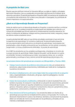 El documento describe el aprendizaje basado en proyectos (ABP), una metodología educativa en la que los estudiantes aprenden a través de la realización de proyectos personales. Explica que el ABP se centra en resolver problemas relevantes para los estudiantes y desarrollar habilidades como el pensamiento crítico y la colaboración. Además, las investigaciones demuestran que el ABP mejora la motivación y prepara a los estudiantes para la educación superior y el mundo laboral. Sin embargo, se requiere formación docente y un camb