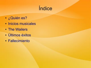 Bob Marley fue un cantante y compositor de reggae jamaiquino. Nació en 1945 en Jamaica y formó la banda The Wailers con Bunny Wailer. Sus canciones reflejaban la creencia Rastafari y alcanzó gran éxito internacional. Marley falleció en 1981 a los 36 años de cáncer.