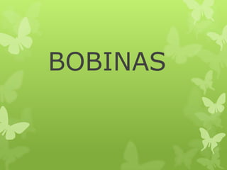 Este documento describe las bobinas, que son componentes pasivos que generan un flujo magnético cuando se hace circular corriente eléctrica a través de ellas. Explica que las bobinas se fabrican con diferentes tipos de núcleos, como aire, hierro-silicio o ferrita, y pueden ser fijas o variables, dependiendo de si el núcleo se puede mover o no para ajustar la inductancia. También cubre las unidades de medida, símbolos y características como la permeabilidad magnética y el factor de calidad de las bob