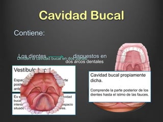 Este documento describe la anatomía de la cavidad bucal. Resume que la cavidad bucal contiene los dientes, lengua y divide en dos partes: el vestíbulo bucal y la cavidad bucal propiamente dicha. Describe las paredes de la cavidad bucal incluyendo los labios, mejillas, paladar superior, paladar posterior y piso de la boca. Explica la constitución anatómica, vascularización, inervación y función de cada una de estas estructuras.