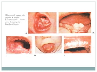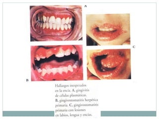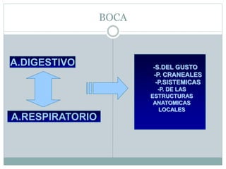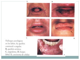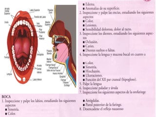 El documento describe la semiología de la cavidad oral y orofaringe, destacando que el examen de la boca permite evaluar diversas patologías del aparato digestivo, respiratorio y otras estructuras anatómicas, así como obtener una sospecha diagnóstica de condiciones como deshidratación, úlceras, herpes, candidiasis, sarcoma de Kaposi, déficit de vitaminas, adenoiditis y neumonía aspirativa.