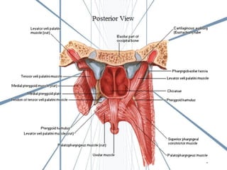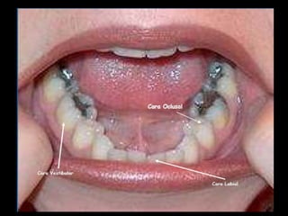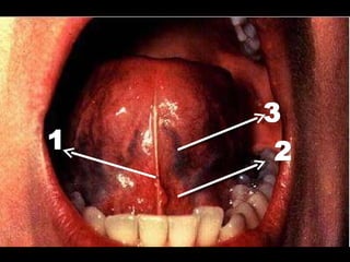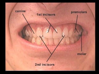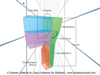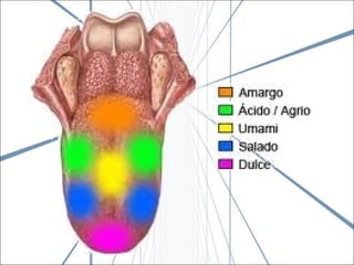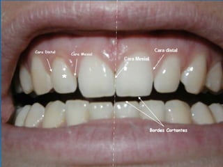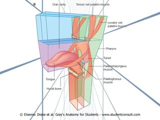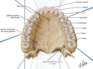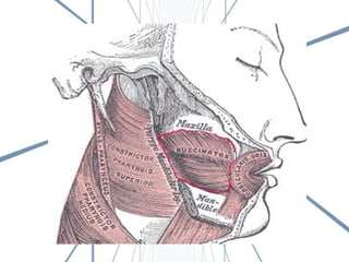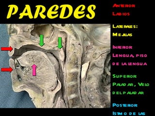 El documento describe la anatomía de la boca. Se divide en tres secciones principales: 1) las paredes exteriores de la boca incluyendo los labios, mejillas y lengua, 2) las dos cavidades de la boca - el vestíbulo y la cavidad bucal propiamente dicha, y 3) detalles internos como la lengua, el paladar y las amígdalas. Explica las estructuras óseas, musculares, nerviosas y vasculares que componen la boca.