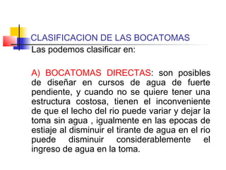 Este documento define y clasifica las bocatomas, estructuras construidas en ríos para desviar parte de su caudal hacia canales de irrigación. Existen tres tipos principales de bocatomas: directas, con barraje fijo y con barraje móvil. Un barraje es una presa que eleva el nivel del agua para alimentar la bocatoma de manera regular. Los elementos clave de un barraje son la presa, la poza de tranquilización y el enrocamiento.