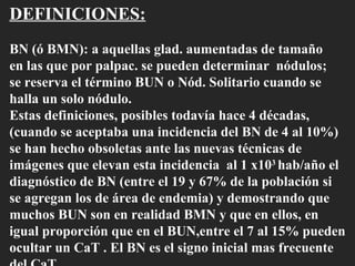 Este documento resume las definiciones, diagnóstico y tratamiento del bocio nodular uninodular y multinodular. Incluye consensos de varias asociaciones sobre la evaluación del nódulo tiroideo mediante ecografía, gammagrafía u otras técnicas de imagen. Describe criterios para el tratamiento clínico, quirúrgico e ionizante del bocio nodular, aunque reconoce que no existen criterios estrictos y el criterio personal del médico es importante.