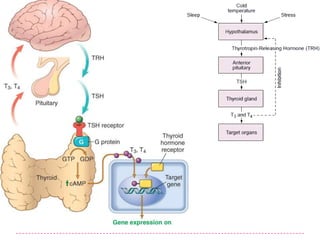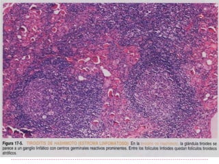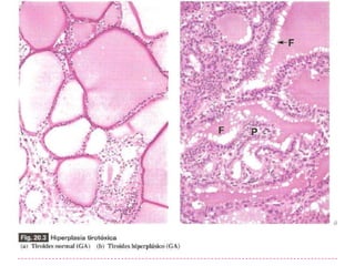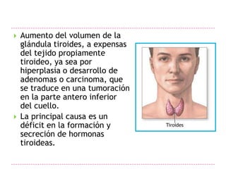 El documento habla sobre el bocio. El bocio es un aumento del tamaño de la glándula tiroides que puede ser causado por hiperplasia, adenomas o carcinoma. Las principales causas de bocio son un déficit en la formación y secreción de hormonas tiroideas o hipertiroidismo. El tamaño de la tiroides depende de factores como la edad, peso, ingesta de yodo y puede medir aproximadamente 4x2x2 cm por cada lóbulo.