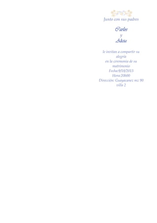 El documento contiene invitaciones a cinco ceremonias de matrimonio con las fechas, horas y direcciones de cada una, incluyendo los nombres de los novios y sus padres.