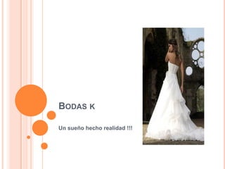 Bodas K es una empresa que se especializa en la organización de bodas y ofrece un excelente servicio. Su objetivo es brindar una atención exclusiva para bodas y su visión es convertirse en una empresa reconocida a nivel nacional por su trabajo en la organización de eventos matrimoniales. Su misión es ofrecer el mejor servicio posible para bodas y ser reconocidos por su excelente trabajo.