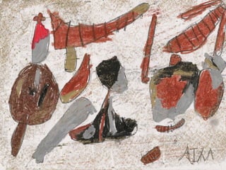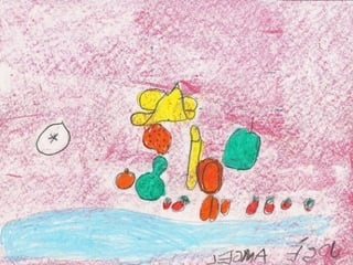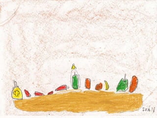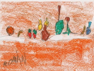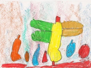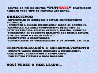 Este documento describe un proyecto en el centro de arte "Pintarte" cuyo objetivo es enseñar a los niños sobre bodegones a través de sesiones que incluyen la búsqueda de información, análisis y comparación de obras de artistas famosos como Picasso, Cezanne, Botero y Barreiro, para que finalmente creen su propio bodegón aplicando lo que han aprendido.