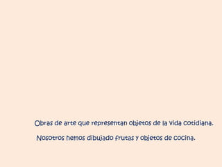 El equipo 4o B, bajo la orientación de los artistas Javier Sanz y Amelia García, ha creado obras de arte que representan objetos cotidianos, enfocándose en frutas y utensilios de cocina. El trabajo destaca el uso de color, formas, luz y composición, celebrando la creatividad de los estudiantes. Se felicita a los participantes por sus creaciones artísticas.