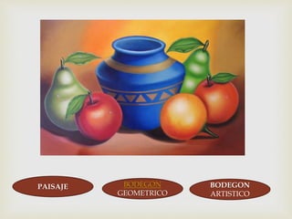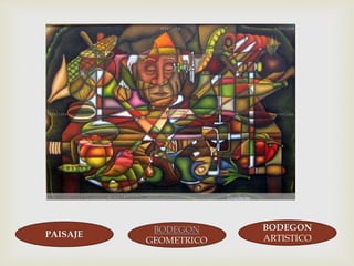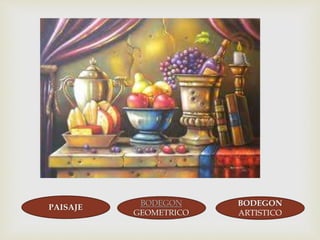 Este documento presenta cuatro opciones de obras de arte: bodejuego, paisaje bodegón, geométrico bodegón y bodegón artístico. El lector debe seleccionar la opción correcta para cada obra de arte presentada.