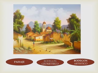 El documento presenta un ejercicio interactivo donde se debe elegir la opción correcta para clasificar diferentes obras de arte entre paisajes y bodegones. Incluye categorías como bodegón geométrico y bodegón artístico. La actividad sugiere una interacción a través de clics para seleccionar las respuestas correctas.