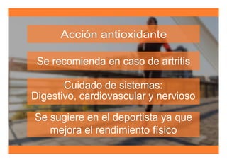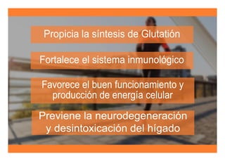 El documento presenta información sobre el b-glutatión y sus beneficios para la salud, incluyendo propiedades antioxidantes, apoyo al sistema inmunológico y mejora del rendimiento deportivo. También menciona ingredientes como el hongo royal sun y el arándano, que contribuyen a la salud cardiovascular y metabólica. Se destaca la importancia del gen nrf2 en la reducción del estrés oxidativo y la prevención de enfermedades crónico-degenerativas.