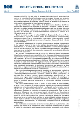 La ley modifica tres leyes relacionadas con los medios de comunicación en Cataluña para racionalizar las estructuras y mejorar la eficiencia. Redujo el número de miembros del Consejo Audiovisual de Cataluña de 10 a 6 y del Consejo de Gobierno de la Corporación Catalana de Medios Audiovisuales de 12 a 6. También suprimió la figura del director general de la Corporación y transfirió sus funciones al presidente del Consejo de Gobierno para ahorrar costos.