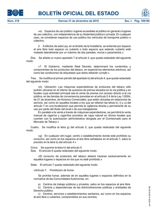 Este documento presenta una ley que modifica la Ley 28/2005 sobre medidas sanitarias frente al tabaquismo en España. Las modificaciones amplían la prohibición de fumar a más espacios públicos cerrados como centros comerciales, transporte público, lugares de ocio y restauración. El objetivo es proteger la salud de los ciudadanos, especialmente menores y trabajadores de hostelería, del humo de tabaco ajeno. La ley alinea las políticas de España con las recomendaciones de la Unión Europea para limitar el consumo de tabaco.