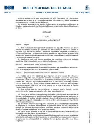 1. El documento establece los requisitos mínimos que deben cumplir los centros docentes que impartan enseñanzas de educación infantil, primaria, secundaria obligatoria, bachillerato y formación profesional en España.
