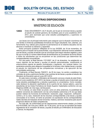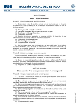 Este documento convoca becas y ayudas al estudio para el curso académico 2011-2012 en España. Se convocan becas de carácter general para estudios postobligatorios y superiores no universitarios, así como ayudas para cursos de preparación y programas de cualificación profesional inicial. La orden establece los componentes de las becas como beca salario, gastos de desplazamiento y residencia, material escolar, y suplementos por ciudad, así como los umbrales de renta familiar para su adjudicación.