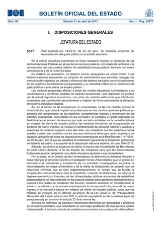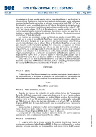 Este documento presenta un Real Decreto-ley que introduce medidas urgentes para racionalizar el gasto público en educación. Se proponen cambios en la educación no universitaria como aumentar el ratio de alumnos por aula y fijar el horario lectivo mínimo del profesorado. También se retrasan cambios en formación profesional y se limita la sustitución de profesores. En la universidad, se modifica la ley para racionalizar la oferta de titulaciones y se gradúa la carga docente en función de la investigación. El objet