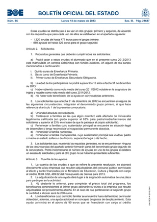 El documento anuncia la convocatoria de 2,200 ayudas para que estudiantes españoles participen en colonias de inmersión lingüística en inglés durante el verano. Las ayudas cubrirán parte de los costos de las colonias y se dividirán en dos grupos, uno con 1,320 ayudas de hasta 476 euros y otro con 880 ayudas de hasta 326 euros, dependiendo de la situación socioeconómica del estudiante. Las colonias de dos semanas se llevarán a cabo en 11 ubicaciones en España y enfocar