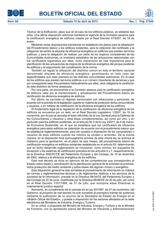 Este documento resume un Real Decreto que aprueba un nuevo procedimiento básico para la certificación de la eficiencia energética de los edificios en España. El procedimiento básico actualiza la normativa anterior a la luz de cambios en directivas europeas, ampliando su ámbito a edificios existentes. Establece la obligación de mostrar y entregar certificados de eficiencia energética cuando se construyan, vendan o alquilen edificios, e incluye disposiciones sobre inventarios, etiquetado y excepciones para edificios públicos.