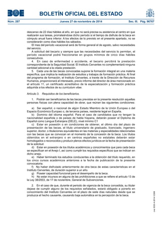 Este documento establece las bases reguladoras y convoca 45 becas de formación y especialización en el Instituto Cervantes para el período 2015-2016. Las becas tendrán una duración de 12 meses y dotación de 800 euros mensuales y se desarrollarán en las sedes de Madrid y Alcalá de Henares. Los solicitantes deberán presentar su solicitud antes de 15 días desde la publicación de la convocatoria acompañada de la documentación requerida.