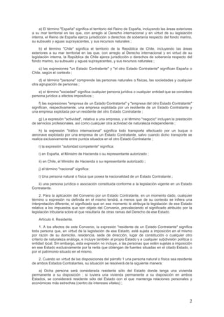 Este documento es el convenio entre España y Chile para evitar la doble imposición y prevenir la evasión fiscal en materia de impuestos sobre la renta y el patrimonio. El convenio establece las definiciones clave, los tipos de impuestos cubiertos, las reglas para determinar la residencia de las personas y empresas a efectos fiscales, y las normas para la imposición de las rentas obtenidas en cada país.
