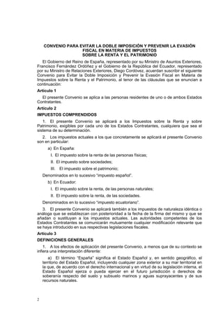Este documento es el instrumento de ratificación del convenio para evitar la doble imposición y prevenir la evasión fiscal en materia de impuestos sobre la renta y el patrimonio entre España y Ecuador, firmado en 1991. El Rey de España aprueba y ratifica el convenio de 30 artículos para evitar la doble imposición de impuestos sobre la renta y el patrimonio aplicables a personas residentes de España y Ecuador.